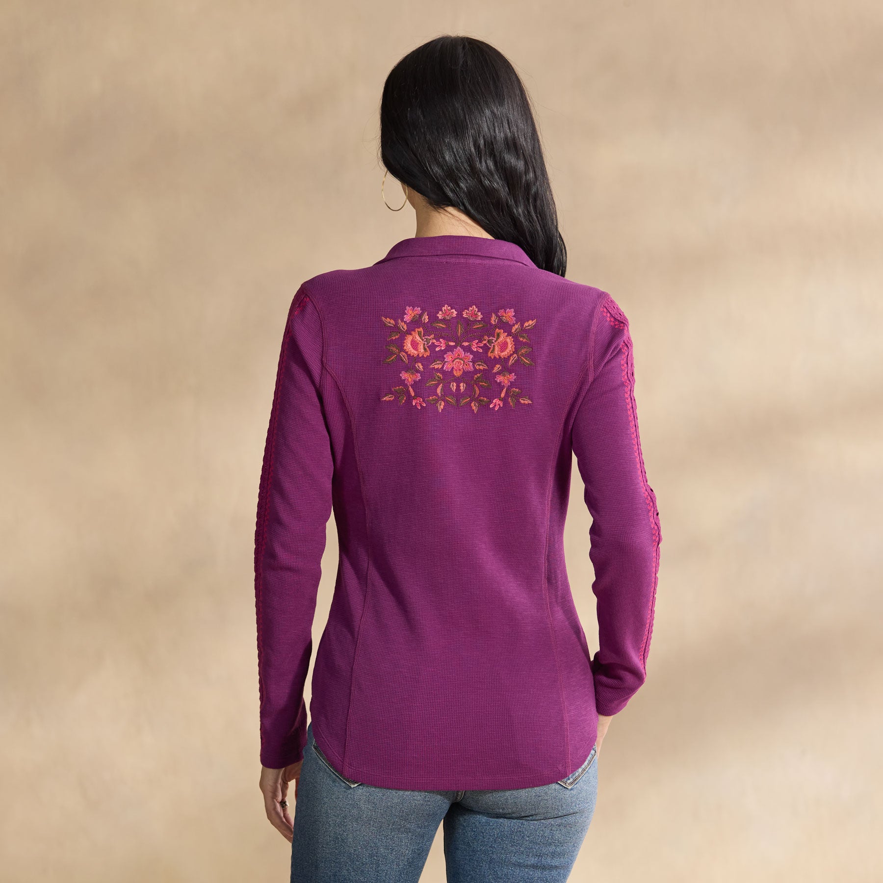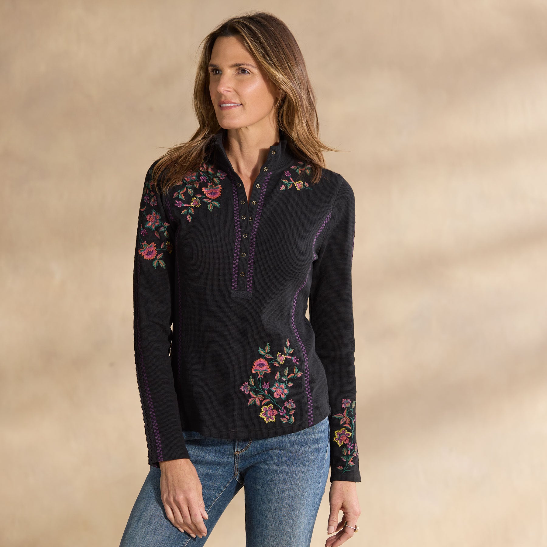 So flattering. our mock neck henley is blooming with stunning. multi colored floral embroidery. feminine lace insets at the sleeves and metal snaps at the placket. Princess seams. Cotton. Machine wash. Imported. Exclusive. Sizes XXS (00). XS (0?C2). S (4?C6). M (8?C10). L (12?C14). XL (16?C18). Approx. 23l.