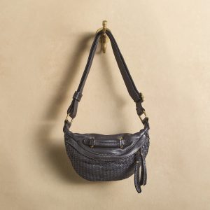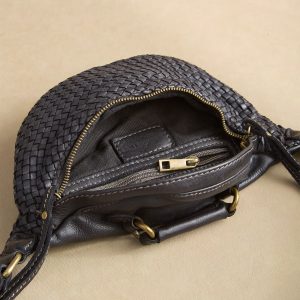 Woven leather and a decorative handle are the highlights of this handcrafted sling bag. which features a back zipper pocket. zipper closure and an adjustable strap. Leather. Italy. Exclusive. Approx. 1.5w x 6d x 11.75h.