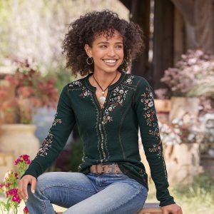 Lovely. multicolored floral and geometric embroidery graces our fitted. notch neck henley with contrast stitching detail. rib trim and princess seams. Metal buttons. Cotton. Machine wash. Imported. Exclusive. Sizes XXS (00). XS (0–2). S (4–6). M (8–10). L (12–14). XL (16–18). Approx. 24l.