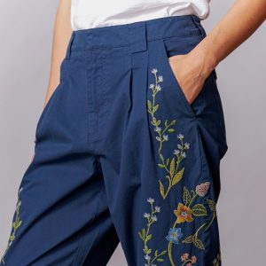 Beautifully detailed four-pocket pants with vintage-inspired. climbing floral embroidery. With pleated front. zip fly and trouser hook with interior button closure. In a garment overdyed wash. Cotton. Machine wash. Imported. Exclusive. Sizes 2-16. 27 inseam