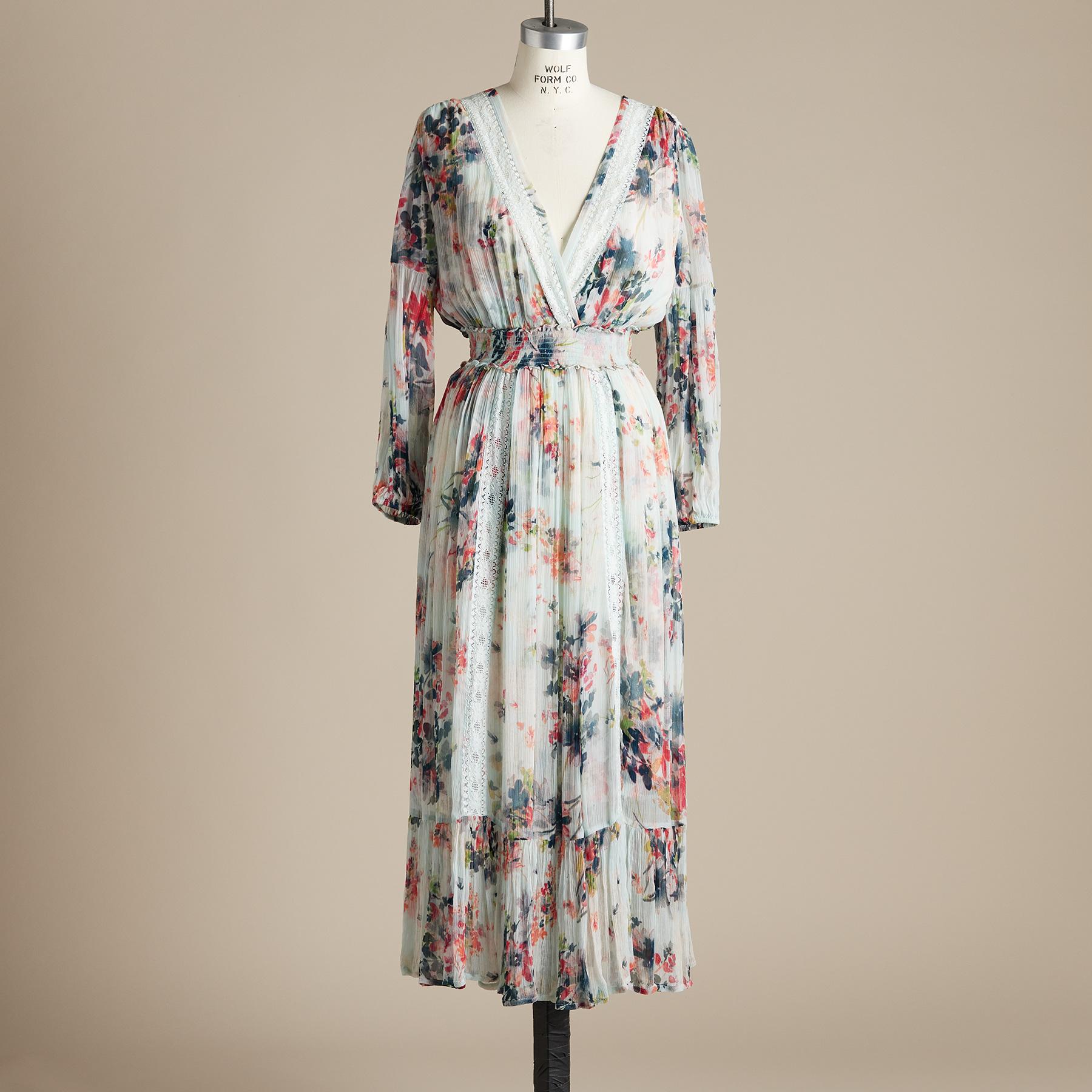 The picture of romance. in crinkle chiffon. with dropped V-neck and deep V-back with tie. Ruffle hem. lace trim. smocked waist and puff sleeves. Fully lined. Cupro. Hand wash. Imported. Exclusive. Sizes XXS (00). XS (0 to 2). S (4 to 6). M (8 to 10). L (12 to 14). XL (16 to 18). Approx. 47-3/4L.