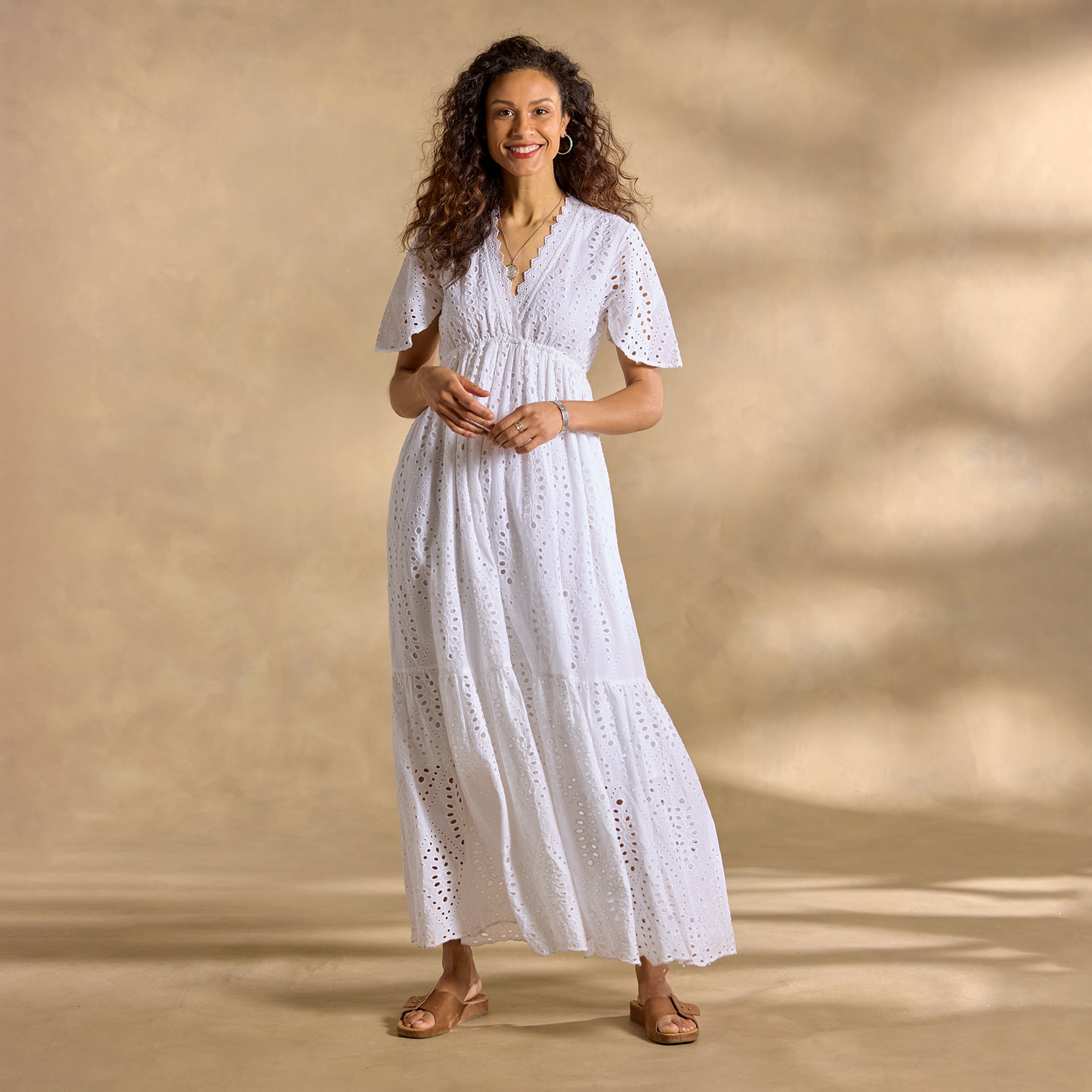 Nothing says weekend like crisp white from head to toe. Fresh and feminine. our essential Juno maxi features all-over eyelet with an easy elastic waistband. flirty flutter sleeves and pretty lace trim at the neckline. Cotton. Machine wash. Imported. Exclusive. Sizes XXS (00). XS (0??). S (4??). M (8??0). L (12??4). XL (16??8). Approx. 49.75l.