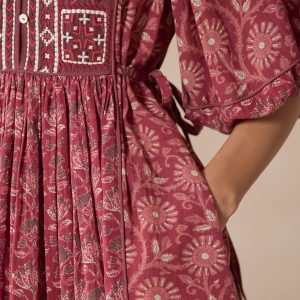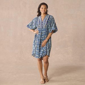 Our easy pop over dress is mixed printed and finished with stunning embroidery at the placket. a flattering V-notch neckline with three looped buttons and puff sleeves with elastic cuffs. Side ties to gather at the center front and back for the perfect fit. Cotton/viscose. Machine wash. Imported. Exclusive. Sizes XXS (00). XS (0??). S (4??). M (8??0). L (12??4). XL (16??8). Approx. 38.5l.