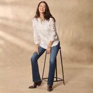 Stunning open applique and eyelet details lend feminine beauty to the sleeves and front bodice of our Monrovia Shirt. Covered buttons and lace trim. Cotton/linen. Hand wash. Imported. Exclusive. Sizes XS (0–2). S (4–6). M (8–10). L (12–14). XL (16–18). XXL (20–22). Approx. 27.5l.