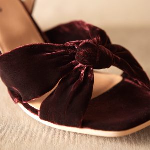 These handcrafted heels feature a velvet knotted upper. covered heel. adjustable strap. square toe and leather lining. Viscose/Cupro. Italy. Exclusive. Whole sizes 36 (US 5.5). 37 (US 6). 38 (US 7). 39 (US 8). 40 (US 8.5). 41 (US 9.5). Approx. 2.25 heel.