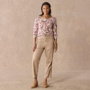 Our easy-fit. utility camp pants are so comfortable and flattering. with a Hollywood waistband. floral and geometric embroidery. metal rivet detail at front pocket and adjustable leg opening. Four pockets. Cotton/lyocell. Machine wash. Imported. Exclusive. Sizes 2?C16. 26.5 inseam