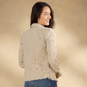 Meet the prettiest piece in your warm-weather wardrobe: Teresa! Shockingly versatile. this tailored lace jacket is a stunner dressed up. over a simple shift??or dressed down with your favorite jeans. All-over embroidered cutwork lace with raw scalloped hem. Welt pockets. Ramie. Machine wash. Imported. Exclusive. Sizes XS (0-2). S (4-6). M (8-10). L (12-14). XL (16-18). XXL (20-22). Approx. 23l.